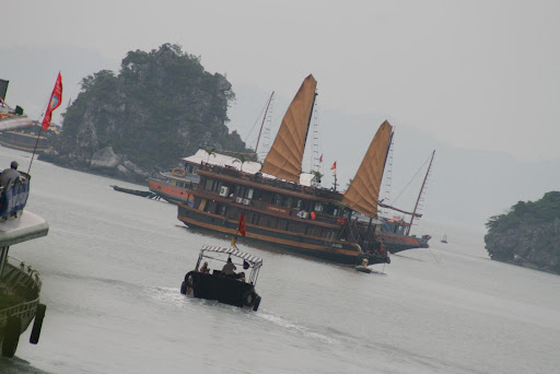 Da Ha Noi un bus, guidato da un idiota patentato, ci ha portati ad Halong City da dove ci siamo imbarcati per una crociera di due giorni a bordo di una junk, tipica imbarcazione alla volta di Ha Long Bay. Quest'ultima e' un'insenatura nel Golfo del Tonchino comprendente circa 3000 isolette e cave formatesi, secondo la leggenda, per i colpi di coda di un dragone nella sua discesa in mare (Ha Long significa letteralmente "dove il drago scende in mare") ed e' un altro dei patrimoni UNESCO dal 1994. La notte in barca e' stata decisamente suggestiva, i paesaggi mozzafiato della baia offrono uno scenario unico e dindimenticabile. Lungo la baia, sosta pranzo ospiti di alcuni degli abitanti del posto: case galleggianti formano villaggi la cui gente vive di pesca ed acqualcoltura, oltre che di turismo ovviamente.